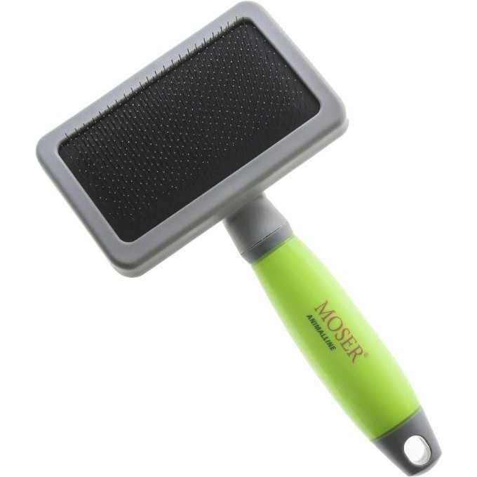 Большая пуходерка Moser 2999-7075 с частой тонкой металлической щетиной и эргономичной силиконовой ручкой используется для расчесывания и удаления нежелательного подшерстка и спутавшейся шерсти у собак крупных пород.